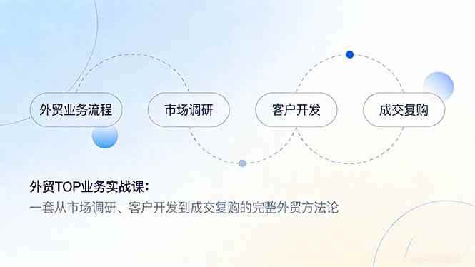 课程来自外贸TOP业务课。460+节精品课程,约10000分钟。从市场调研、客户开发、高能邮件,到价格谈判、风险把控、实战参展,甚至如何管理供应链和代理商,覆盖了外贸全链路。400多节视频课,搭配海量实用工具和模板,就是帮你把每个环节踩透、做精。想从小白变高手,或让业绩再突破,让你的外贸业绩,成交率不翻倍都难!