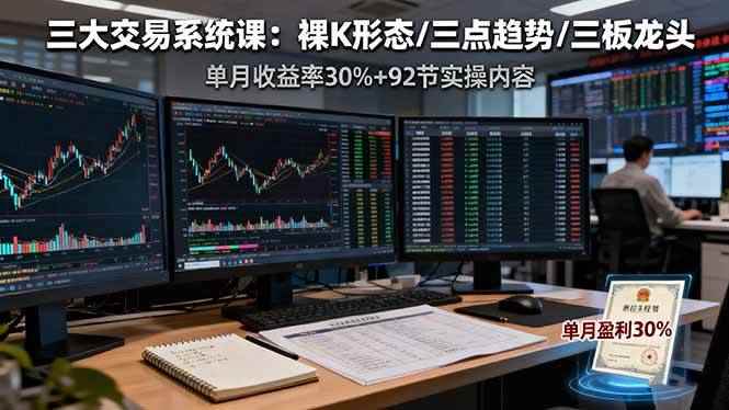 三大交易系统课 裸K、三点、三板三大交易系统课程,覆盖92节实操内容。24节三板战法聚焦龙头股操作,拆解首板到多板进阶、弱转强等实战技巧;20节三点战法详解趋势分析,教你画趋势线、判断突破与反转;48节裸K系统从K线基础形态入手,深入解读涨跌逻辑与买卖点。整套课程从基础到进阶,助力交易者构建系统化交易思路。