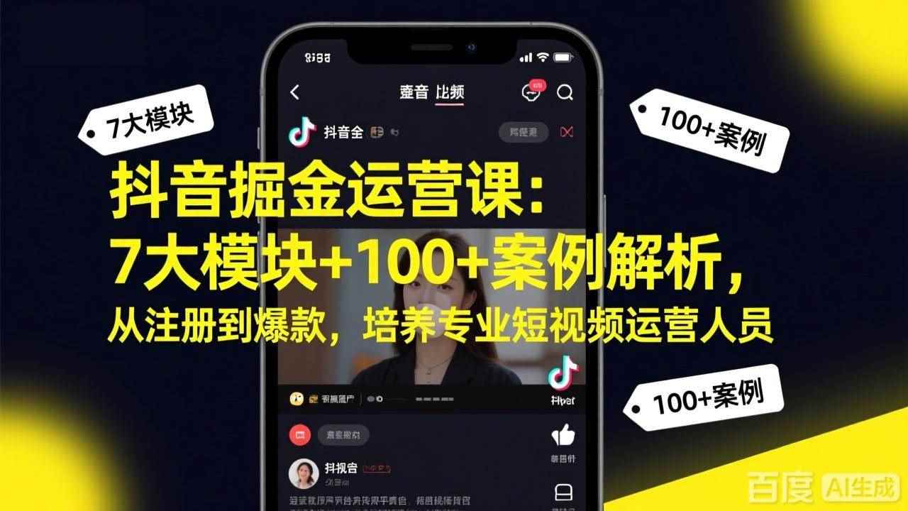 本课程是一套系统化、超细颗粒度的抖音短视频运营实战体系,旨在培养具备专业能力的优秀运营人员。课程涵盖七大核心模块:从短视频发展趋势、平台算法机制等基础认知,到设备网络处理、高权重账号注册等实操技巧;从账号包装、养号诀窍、冷启动策略,到不同运营期的重点差异;从内容定位、选题库搭建、爆款内容特质分析,到蹭热点技巧、账号转粉与推荐量问题的底层解决方案。通过100+案例解析与场景化教学,帮助学员建立完整的抖音运营知识框架,掌握从0到1打造掘金账号的核心能力。
