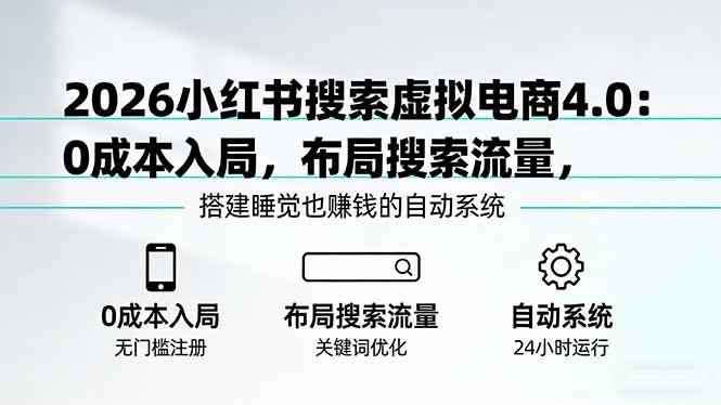 本课程是2026年小红书搜索虚拟电商陪跑训练营4.0,聚焦“0成本投入、操作简单、被动收入”三大核心优势。课程系统讲解小红书虚拟电商的完整玩法:从平台政策红利(虚拟商品专属类目、一店四号免实名)到搜索流量布局(通过笔记布局搜索流量,实现无需持续运营的自动成交),再到全流程实操(选品测品、货源链路、笔记工业化生产、自动发布工具、自动发货设置、投流课程、数据采集工具)。课程还涵盖进阶批量制作笔记、兼职培训视频、常见卡点总结等内容,帮助学员搭建一个“睡觉时也在赚钱”的自动盈利系统,抓住小红书官方扶持虚拟电商的千载难逢红利期。