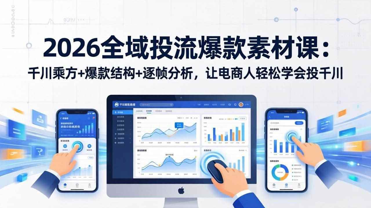 本课程是一套2026全域投流爆款素材实战课,聚焦千川投放与爆款素材生产全链路,帮助电商从业者系统掌握投流核心技能。课程围绕**三大爆块**展开:**全域计划搭建**(计划搭建流程、素材追投高ROI步骤、一键起量设置、素材测试3步骤、直投与素材数据复盘、整场直播数据复盘);**爆款素材生产**(两种全域爆款素材结构、3分钟找对标在投素材、爆款文案与画面核心、逐帧分析垃圾/优质素材案例、10分钟快速挖掘起量卖点、不同爆款文案模版快速复制、跨类目抄爆款起量大法、同一卖点拍出爆款画面、机制类素材爆量拍摄方式、大公司人海战术与小公司产品海战术);**千川乘方应用**(千川乘方带来的投流变化、适合投放的账号类型、主页视频流量决定乘方流量、直播间高转化率承接方法)。课程通过大量案例逐帧分析,让电商行业人人学会投千川,轻松产出高消耗爆款素材。