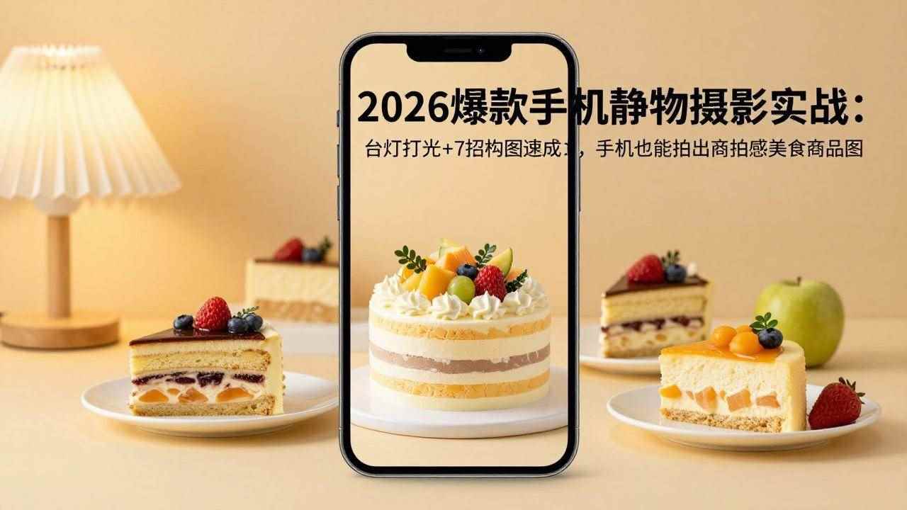 本课程是一套2026年爆款手机静物摄影实战课,教你用手机拍出商业质感的静物图。课程涵盖打光篇(台灯打光大法、光影秘籍)、构图与情境篇(7招构图速成、拍摄角度、道具创意)、热门风格篇(AI摄影实战、Live图动感秘籍、商品摄影进阶、漂亮饭拍摄技巧)、调色与后期篇(废片变大片、电影感调色)等13节实拍教学。从光线、构图到AI与实拍结合,手把手教你拍出高质感美食、商品照片,轻松开拓副业。